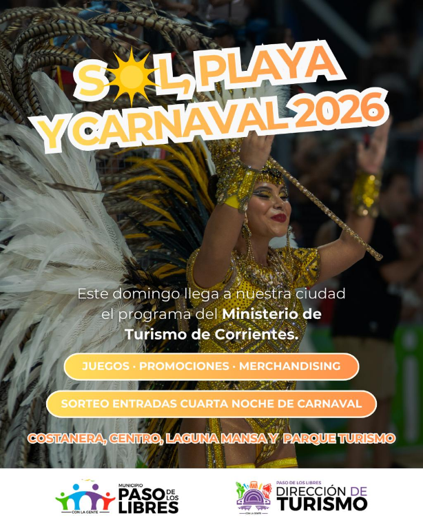 La Municipalidad de Paso de los Libres informa que este domingo nuestra ciudad será sede del programa “Sol, Playa y Carnaval 2026”, impulsado por el Ministerio de Turismo de la Provincia de Corrientes, a cargo del ministro Juan José Braillard Poccard. La propuesta tiene como objetivo dinamizar la actividad turística y económica del interior provincial durante la temporada de verano, combinando actividades recreativas en playas con la pasión y el color de los carnavales locales. La iniciativa ya recorrió localidades como Monte Caseros, Goya, Bella Vista, Ituzaingó, Curuzú Cuatiá, Esquina y Santo Tomé, y continúa su itinerario por distintos puntos de la provincia. En Paso de los Libres, las actividades se desarrollarán en la Costanera, el centro, Laguna Mansa y el Parque de Turismo, donde equipos técnicos estarán ofreciendo juegos interactivos, entrega de merchandising, promoción de productos locales y difusión de destinos turísticos. La jornada combinará propuestas recreativas durante la tarde y el acompañamiento a la fiesta de los corsos por la noche. Además, se realizarán sorteos y entrega de entradas para la última noche del Carnaval, invitando a vecinos y visitantes a sumarse a esta experiencia que celebra el verano y la identidad cultural de la región. De esta manera, Paso de los Libres se integra a esta propuesta provincial que busca fortalecer el turismo, promover la economía local y potenciar uno de los eventos más representativos de la temporada. Nota: Prensa Oficial Paso de Los Libres www.kepeguafm.com.ar